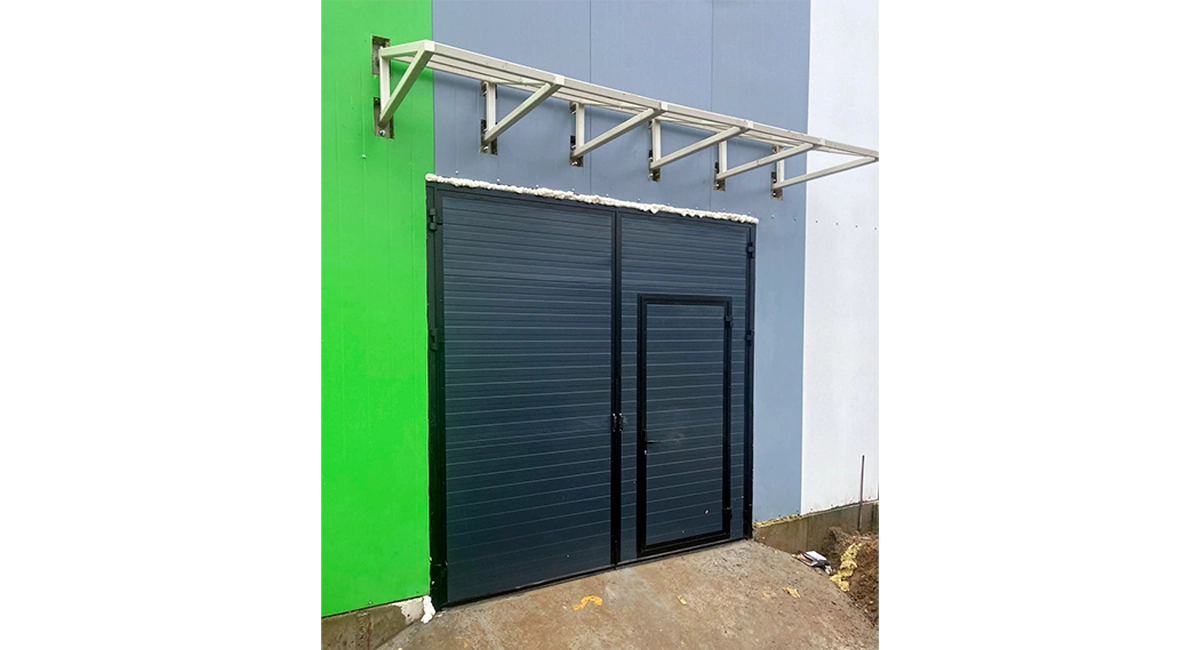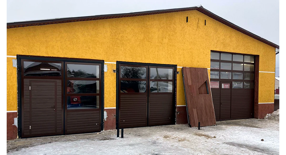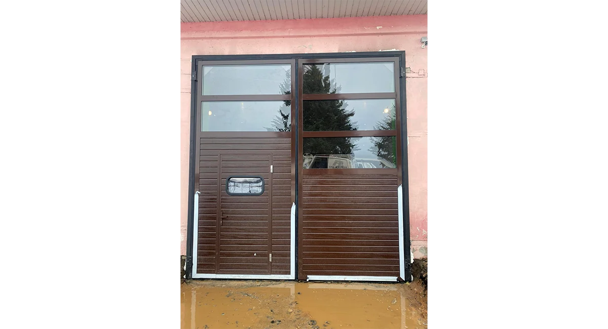 Двери изготавливаются из тех же сэндвич-панелей, что и ворота, включая панорамные вставки и остекление.